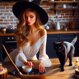 De zwarte kat en de puntmuts zag ik niet eens net als de bezem die in een hoek van de kamer stond.